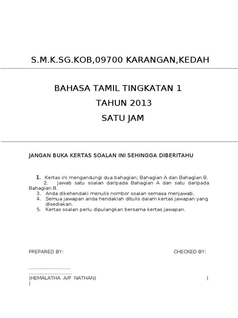 Kertas Soalan Bahasa Tamil Tahun 1 : Soalan Matematik Tahun 1 Sjkt Adinasinc : Kertas soalan ini mengandungi dua bahagian, documents.