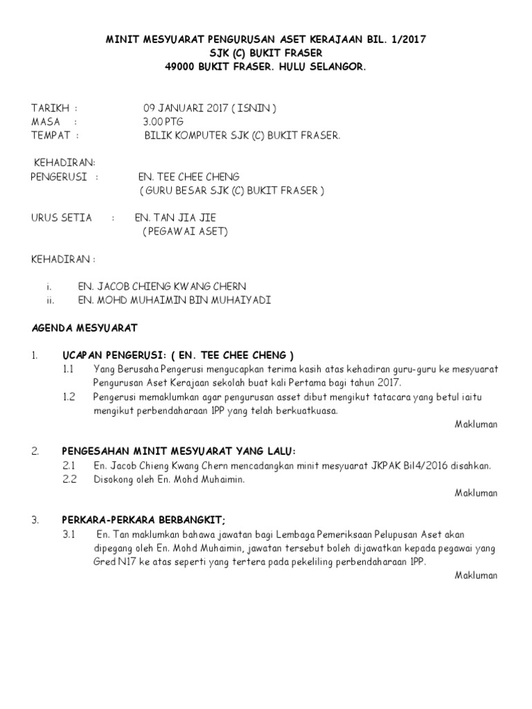 Contoh Minit Mesyuarat Pengurusan Sekolah Malayagas from imgv2-1-f.scribdassets.com Minit mesyuarat aset alih 1. Bilik mesyuarat seri anggerik pengerusi : En mohd johari bin muda Rujuk lampiran 1.0 ucapan pengerusi 1.1 puan hj. Bilik mesyuarat sekolah kebangsaan bukit mahkota pengerusi: Buku rekod minit mesyuarat guru dan staf sekolah. Oleh kerana kekangan pendemik covid 19 maka mesyuarat jawatankuasa pengurusan pusat sumber bil 1/ 2021 telah dibuat secara atas talian iaitu google meet. 29 disember 2015 masa :