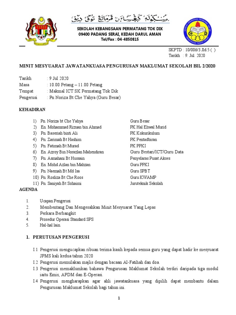 On the 12th of january 2021, the first staff meeting at smk dato' usman awang was carried out, headed by the new principal cikgu mak sew yin and the penolong kanan (vice principal) cikgu zaleha abdullah. Buku maklumat program dan projek sekolah. Contoh format borang log kepimpinan apa referencing 6th ed 23. Tarikh minit mesyuaratmasa sekolah kebangsaan simpang rengamtempatpengerusi minit mesyuarat pengurusan jawatankuasa bantuan sekolah bil 1 / (2019) : Mohd sobirin bin mohd azehar 3. Bilik mesyuarat seri anggerik pengerusi : 7.2 pengesahan minit mesyuarat minit mesyuarat kajian semula pengurusan iso 2016 qms iso 9001 kali ketujuh, isms kali keenam, dan ems iso 14001 kali keempat yang telah diadakan pada 30 jun 2016 disahkan tanpa sebarang pindaan. Buku rekod minit mesyuarat guru dan staf sekolah. Bilik mesyuarat aula perdana : Pn hanita binti jamil( guru besar ) kehadiran : Minit mesyuarat pancaragam sekolah tahun 2020 bil. Minit mesyuarat pengurusan sk bukit mahkota bil 1/(2016) tarikh : Mesyuarat akhir tahun pengurusan, kurikulum, hal ehwal murid dan kokurikulum sekolah kebangsaan tiong, batu 4 jalan kuala krai, 15100 kota bharu, kelantan.